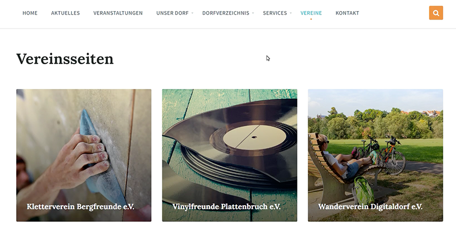 Im Frontend Deiner Dorfpage kannst Du im Hauptmenu den Menupunkt Vereine finden. Klickst Du hier drauf, kommst Du zu der Unterseite, auf der alle angelegten Vereine angezeigt werden.