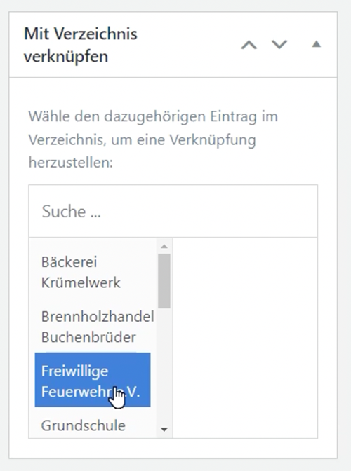 Unter dem, Punkt Mit Verzeichnis verknüpfen kannst Du diese neue Vereiensseite mit einem Registereitrag verknüpfen, der bereits besteht. Wähle dazu einfach den passenden Eintrag aus der linken Spalte und klicke darauf. Nun erscheint er in der rechten Spalte. Diese neue Vereinsseite ist nun im bereits bestehenden Registereintrag zum Verein verlinkt.