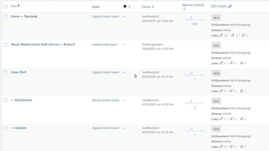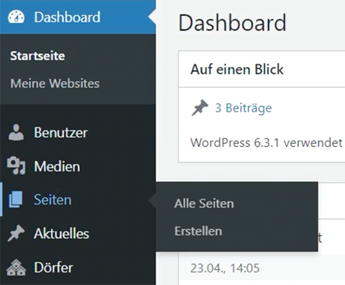 Wähle im Menu den Punkt Seiten aus und navigiere so zur Ansicht aller aufgelisteten Seiten Deiner Dorfpage.