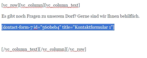 Du kannst jedoch nicht alle Seiten bearbeiten – Bei Seiten wie z.B. Aktuelles oder Kontakt findest Du keine klassischen Text- und Bildinhalte. Hier wären z.B. nur die Beiträge zum Thema Aktuelles verknüpft oder es werden technische Module angezeigt, die wie folgt aussehn können. Verändere diese nicht, indem Du Klammern oder anderen Zeichen löscht. Dies kann Fehlfunktionen auf der Dorfpage führen.