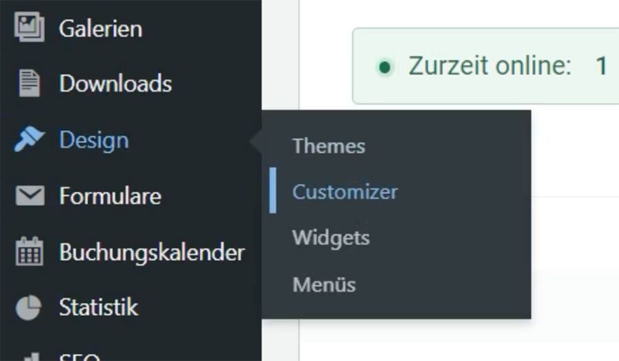 Wähle im seitlichen Menu unter Design den Customizer aus.