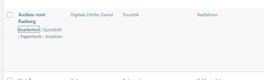 In der Auflistung der Veranstaltungen wählst Du nun die Veranstaltung Ausbau vom Radweg aus. Du kannst Hier direkt auf die Option Bearbeiten klicken.