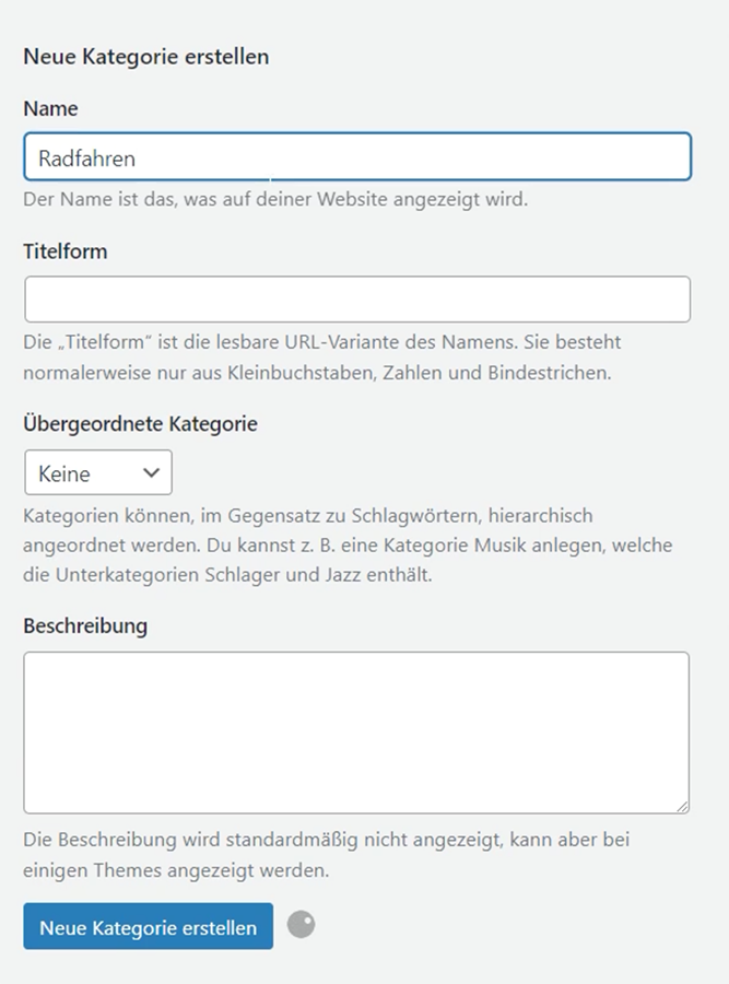 Für eine Veranstaltung, in dem es ums Fahrradfahren geht oder eine Radtour, kannst Du nun die neue Kategorie Radfahren anlegen. Klicke zum Schluss auf den blauen Button Neue Kategorie erstellen.