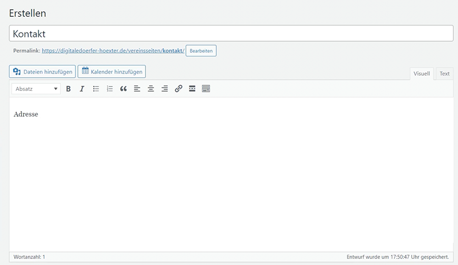 Vergib über den Editor einen Seitennamen und gebe entsprechend Text für die Unterseite ein.