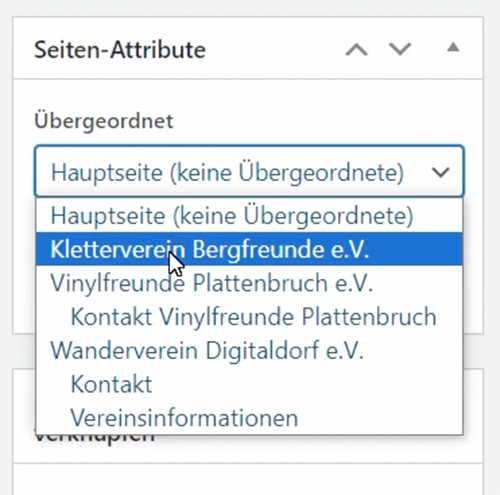 Seitlich in der rechten Spalte kannst Du nun über Seiten-Attribute diese neue Seite einer bestehenden Seite unterordnen. Klicke einmal auf das kleine Drop-Down-Menu, damit Dir alle Seiten Deiner Dorfpage angezeigt werden. Wähle die übergeordnete Seite hier aus.