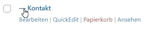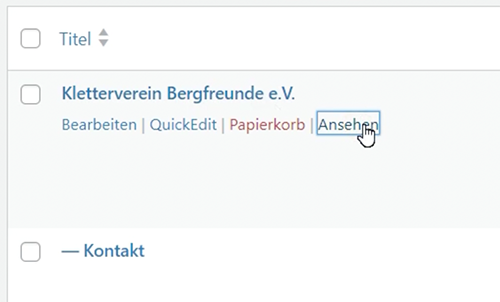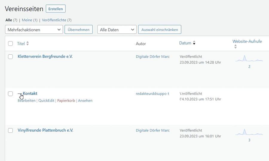 In der Auflistung der Vereinsseiten findest Du nun auch die neuangelegte Seite. Der Strich vor dem Seitennamen zeigt Dir hier in der Auflistung, dass diese Seite der darüber aufgelisteten Seite (hier der Kletterverein Bergfreunde e.V.) untergeordnet ist.